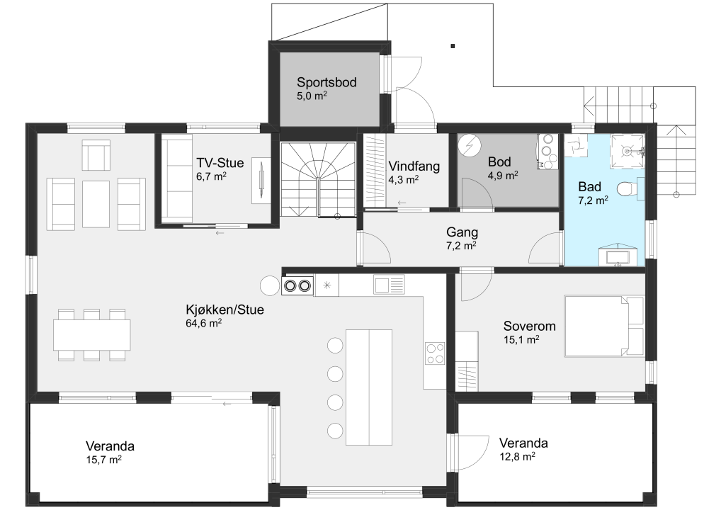 Hovedetasjen byr på et åpent stue- og kjøkkenområde med store vinduer, to verandaer, TV-stue og soverom.
