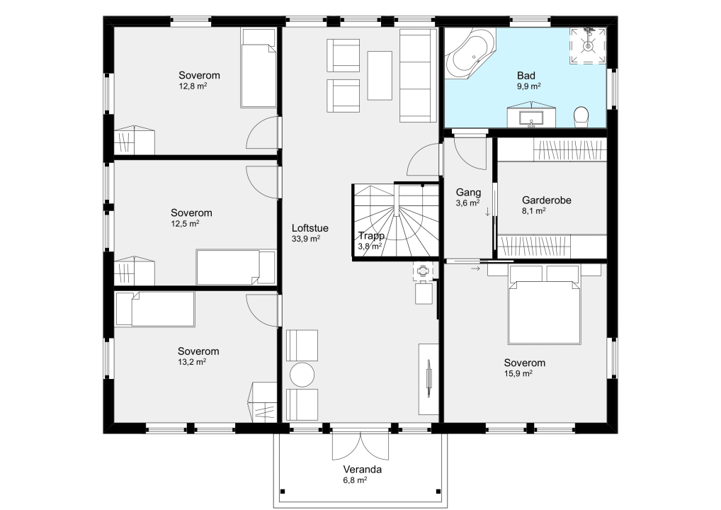 I boligens andre etasje finner du store soverom, bad og gode garderobeløsninger. Den romslige loftstuen, med utgang til veranda, gir boligen flere soner for sosialt samvær og avslapning.